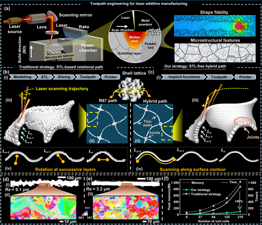 激光扫描路径工程:(a)PBF-LB打印系统及单道成形示意图;(b-c)基于STL的旋转扫描路径及混合路径对比示意图;(d-e)薄壁的EBSD图;(f)建模处理效率对比。