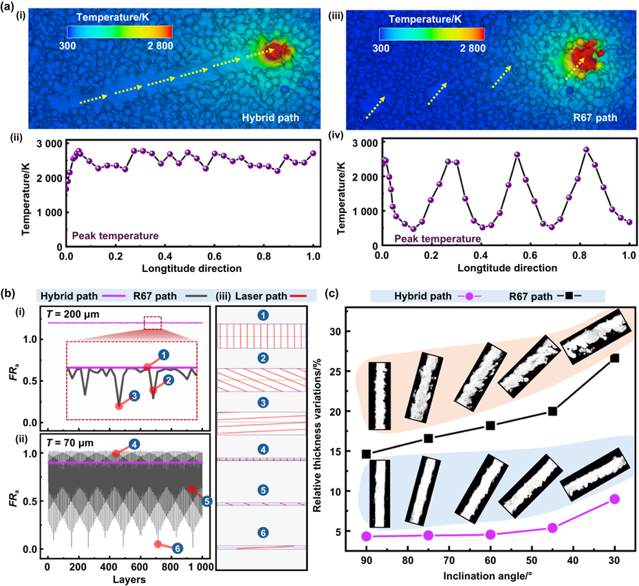 图3. 薄壁结构的成形性分析:(a)单道扫描及旋转路径扫描下的温度场分布及峰值温度变化;(b)薄壁的能量输入稳定性分析;(c)不通倾角的薄壁打印质量对比。