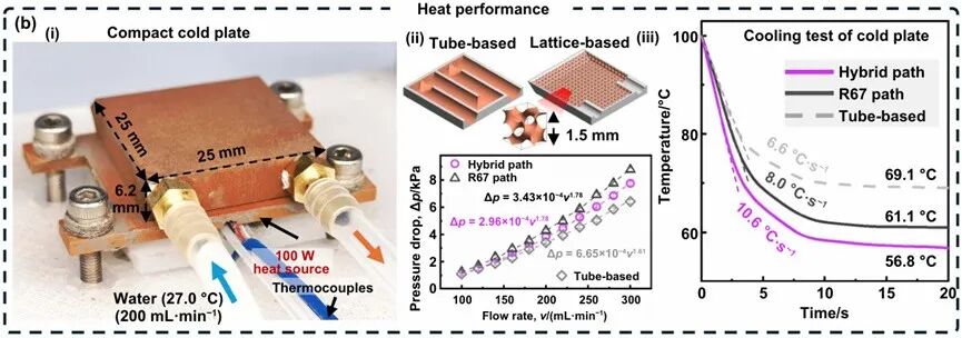 使用纯铜打印微型冷却板(25 mm × 25 mm × 6.2 mm),在100 W热源条件下测试热管理性能: