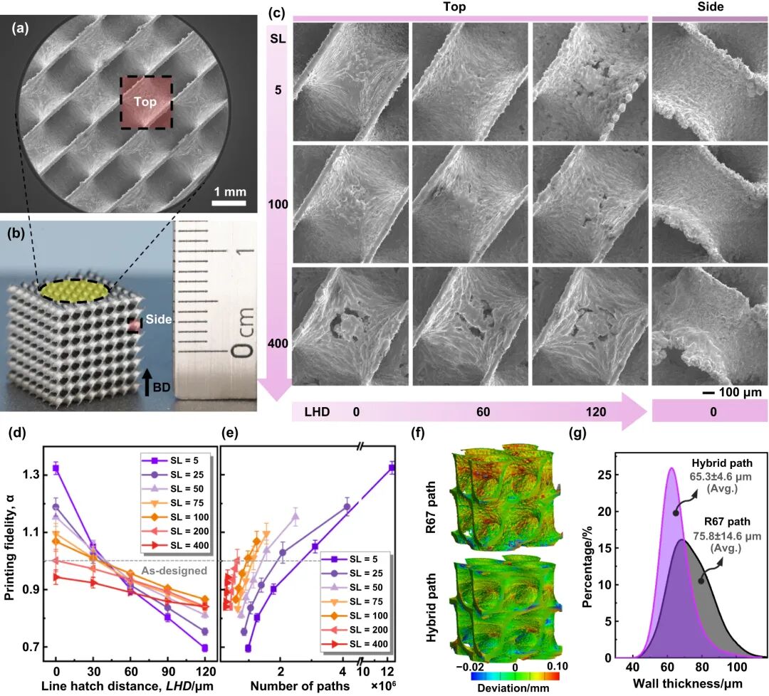 打印参数对制造精度的影响: (a) 和 (b) 直接打印的D型TPMS格子结构。 (c) 在不同工具路径参数下直接打印的格子的形态。 (d) SL 和 LHD 对制造精度的影响。 (e) 扫描路径数量对制造精度的影响。 (f) 三维偏差 (g) 壁厚分布。
