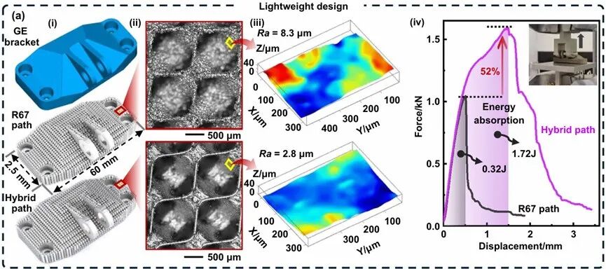 研究团队基于知名的GE轻量化支架案例,通过TPMS填充结构与两种路径策略对比,结果显示: