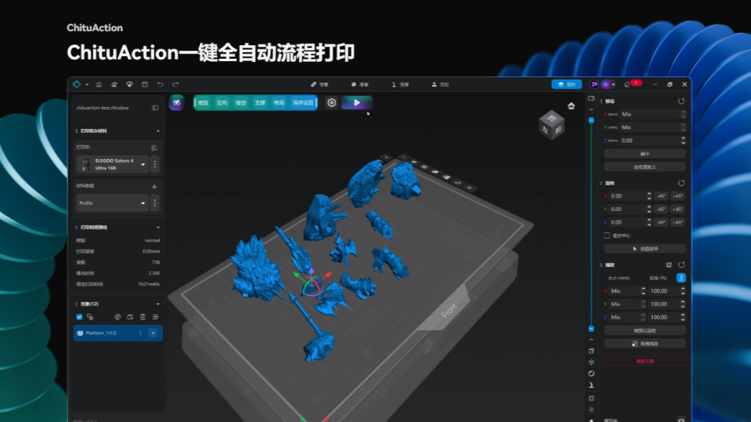 近日,CHITUBOX推出强大更新。与之前基础版相比,模型加载速度提升高达13倍,切片文件保存速度提升5倍,支撑预处理速度提升10倍,悬垂检测速度提升34倍,孤岛检测速度提升88 倍。除了这些改进之外,精简的界面使导航和编辑更加流畅。