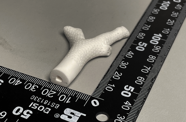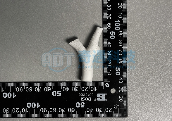 在功能陶瓷的研究与应用探索中,实验件往往承载着“验证思路、启发应用”的双重价值。图中展示的这款由氧化铝打印而成的分叉状样件,表面布满细密的点状纹理,整体形态类似枝状或分流管道——既是对陶瓷3D打印复杂成型能力的直观体现,也是科研人员进行仿生设计与功能拓展的重要载体。
