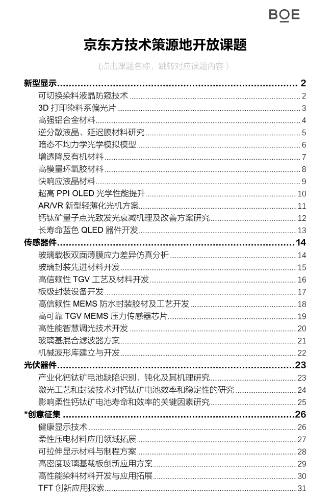3D打印技术参考注意到,京东方于近日发布《2025技术策源地开放课题计划》,包含定向课题24项,其中两项涉及3D打印技术。分别为“3D打印染料系偏光片”以及“高模量环氧胶材料”。