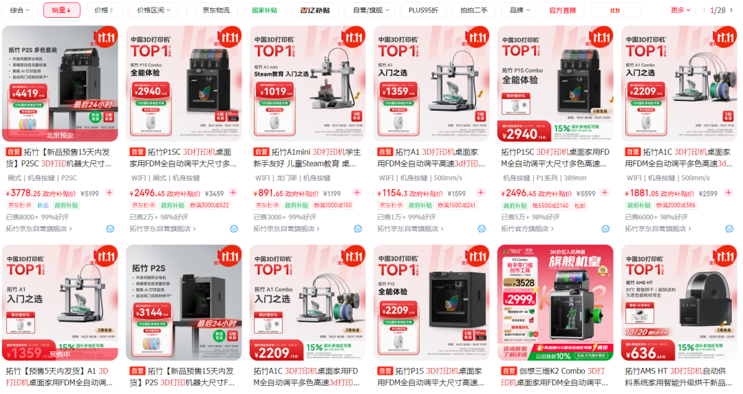 京东11.11启动以来,从线上到线下,消费热潮持续不断。数据显示,截至10月20日18时,京东平台3D打印机销量同比增长200%。各品牌优惠力度极大,多色套装价格跌至新水平,销售前十仍旧由拓竹包揽。