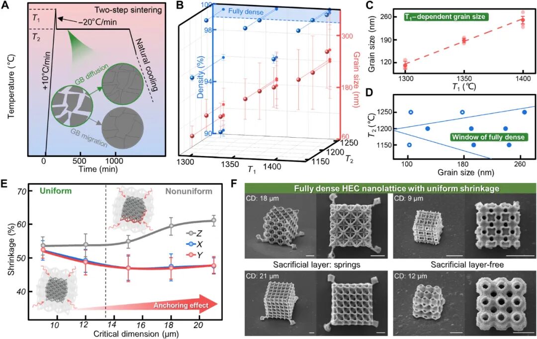 据中国科大新闻网,该校李家文教授课题组近日在高熵陶瓷微纳尺度三维打印领域取得重要进展。他们开发出一种通用且高效的多元陶瓷微纳尺度三维打印方法,成功实现了具有亚微米特征尺寸的多元陶瓷三维结构制造,并制备出超轻、超强特性的高熵陶瓷纳米晶格三维超材料。