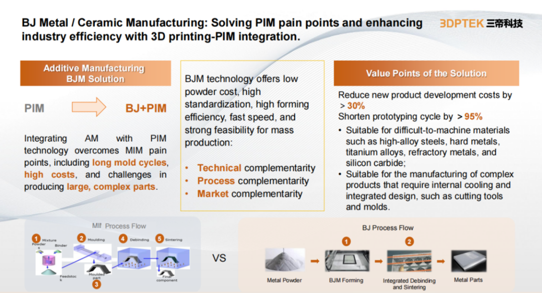 宗贵升博士指出,传统粉末注射成型技术常受限于模具成本高、开发周期长与产品尺寸约束。三帝科技通过粘结剂喷射(BJ)3D打印技术,实现了无模具制造、复杂结构快速成型与大尺寸零件生产,为行业提供了更具竞争力的解决方案。目前,该技术已在3C电子、汽车、航空航天、AI芯片散热、液冷系统等领域实现规模化应用。