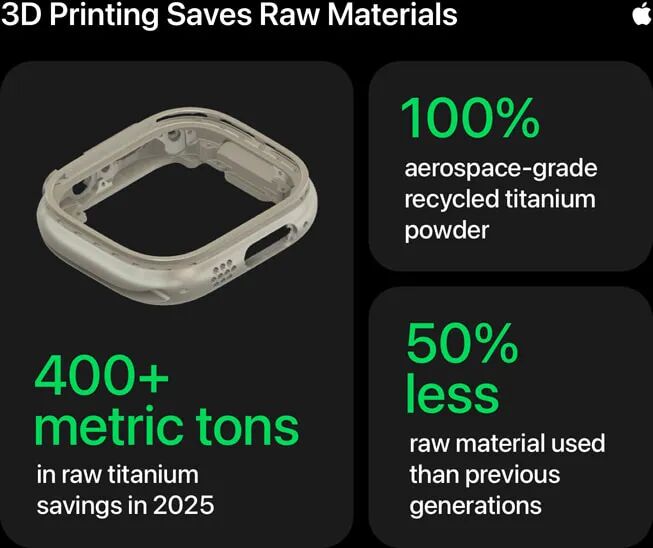 11月18日,苹果官宣指出今年所有Apple Watch Ultra 3和钛合金Apple Watch Series 11的表壳都采用100%回收的航空级钛粉3D打印而成。