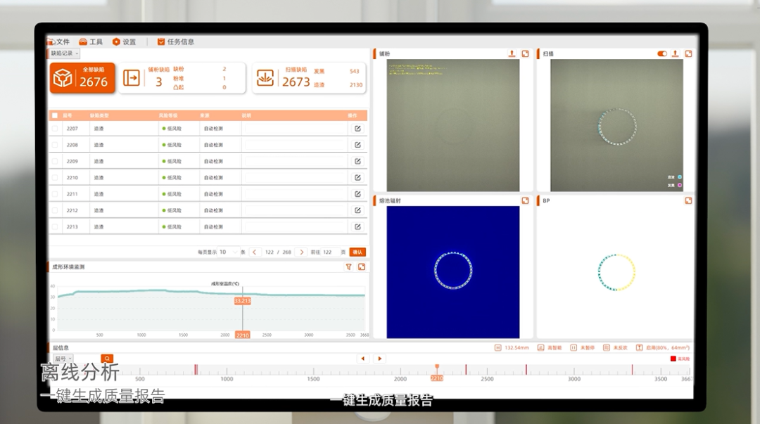 离线分析模块专为质量管理、工艺优化及科研分析场景设计,基于打印完成后的数据评估零件质量,实现零件风险区域精准识别与工艺迭代优化。该模块包含四大核心功能:三维模型可视化、缺陷记录管理、多源数据融合看板与一键生成质量报告。