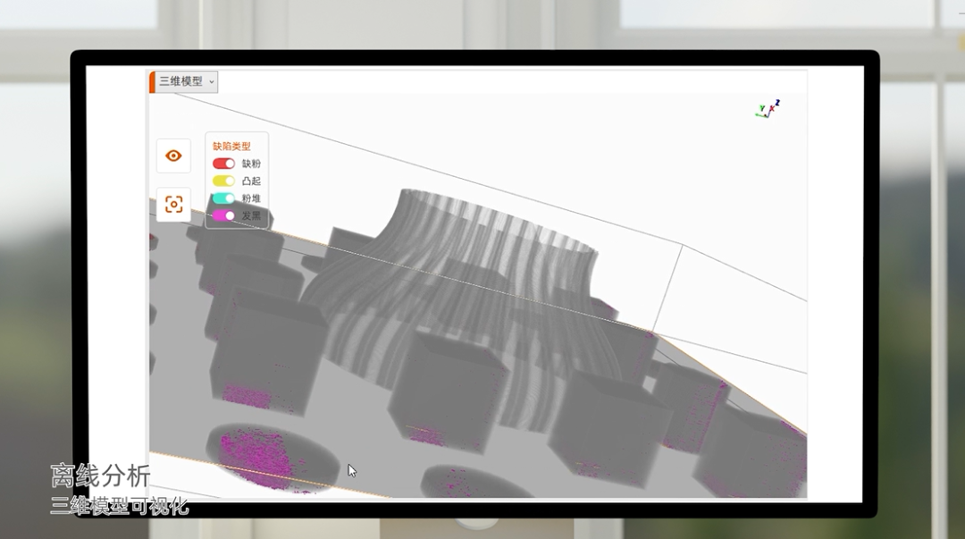 三维模型可视化基于三维逆向建模,通过重建零件模型,将AI实时识别的缺粉、发黑、凸起等缺陷精准映射至模型,构建打印零件数字孪生体。这一功能可让用户直观掌握风险分布,解决了传统模式缺陷定位不精准、识别效率低下的难题。