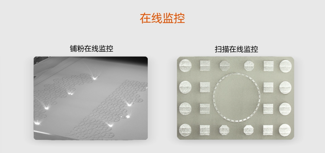 在线监控模块聚焦生产现场核心需求,通过先进视觉算法,打破依赖人工经验的传统缺陷识别模式,实现打印过程智能检测与可视化。该模块包含铺粉在线监控功能和扫描在线监控功能。铺粉在线监控可以实时检测粉末铺设质量,识别缺粉、粉床不平整、区域塌陷、刮刀剐蹭等异常并自动闭环修正,从源头减少成形缺陷。扫描在线监控能实时检测激光扫描质量,识别表面发黑、熔渣堆积等异常并及时预警,帮助操作人员实时掌握打印状态,降低异常发生风险。
