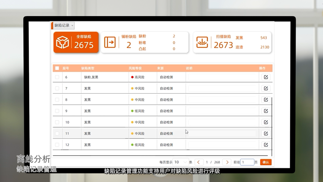 缺陷记录管理支持缺陷风险评级、缺陷列表管理、异常问题一键上报及自定义检测模型灵敏度。此功能简化了传统检测中的繁杂工序和高昂成本,同时用户还可上报新缺陷样本,反哺模型训练,使AI算法持续精准优化。