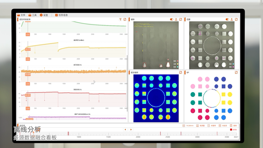 多源数据融合看板统一接入并同步对齐打印参数、环境数据、设备状态、铺粉与熔融的视觉图像等多维度质量数据;并支持异常“一键回溯”,联动查看关联数据,帮助追溯缺陷成因。通过还原打印实况,解决零件质量数据碎片化、评估结果滞后的问题。