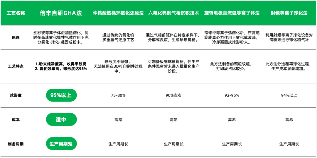 倍丰通过自研GHA工艺将钨粉的生产效率大幅提升,较传统工艺提升近一倍;其次,GHA工艺通过优化雾化流场设计与气体循环系统,显著降低氩气消耗量,从根本上削减了耗材支出。并且GHA工艺摒弃了分选和再球化的工艺流程,大幅降低生产周期,大大提高了生产效率,为增材制造的大规模工业化应用扫清了原材料成本障碍。