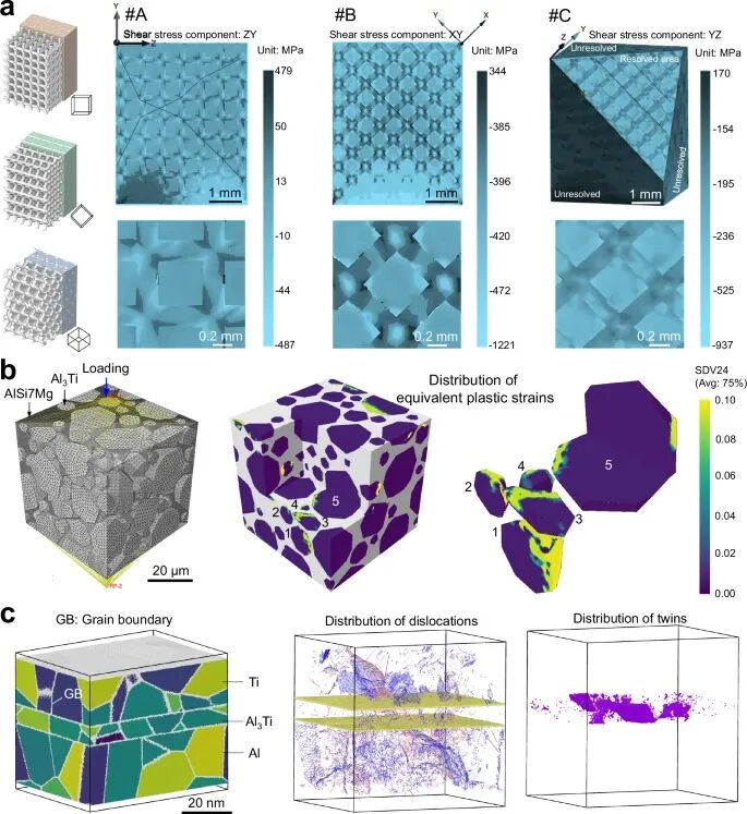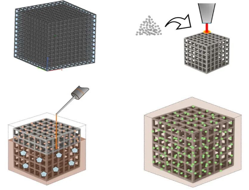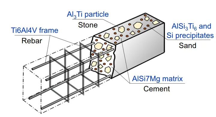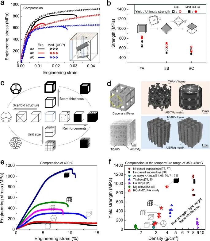 传统铝合金和铝基复合材料在高温(>300°C)下强度显著下降,限制了其在高温环境中的应用。而在钢筋混凝土结构中,钢筋提供抗拉强度,混凝土提供抗压强度。研究人员以此为灵感,设计出在金属3D打印晶格结构中引入铝基复合材料的多尺度增强结构。