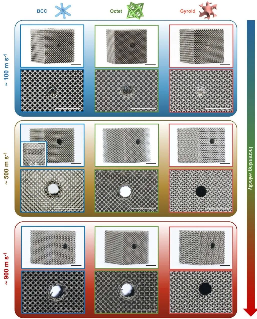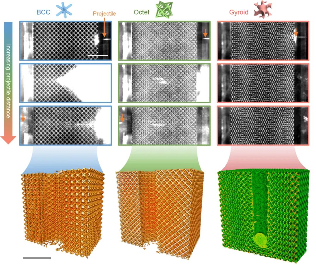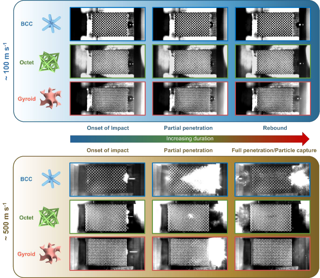 研究人员设置了实验装置,不锈钢球体借助气枪加速,接着用高速摄像机去观察撞击的过程,小弹丸以超500m/s的速度,完全穿过了BCC和八面体晶格,而陀螺晶格却成功挡住了弹丸,即便速度超过900m/s时也无法完全穿过。