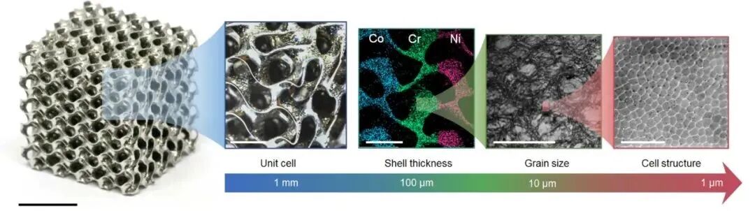 从微晶格的层级构造来看,陀螺微晶格壳层厚度不到100微米,它和所构成的能量色散X射线映射重叠,凭借电子背散射衍射图像的质量图,可以看见合金的晶界,还有HR-SLM引发产生的纳米级位错晶胞网络。