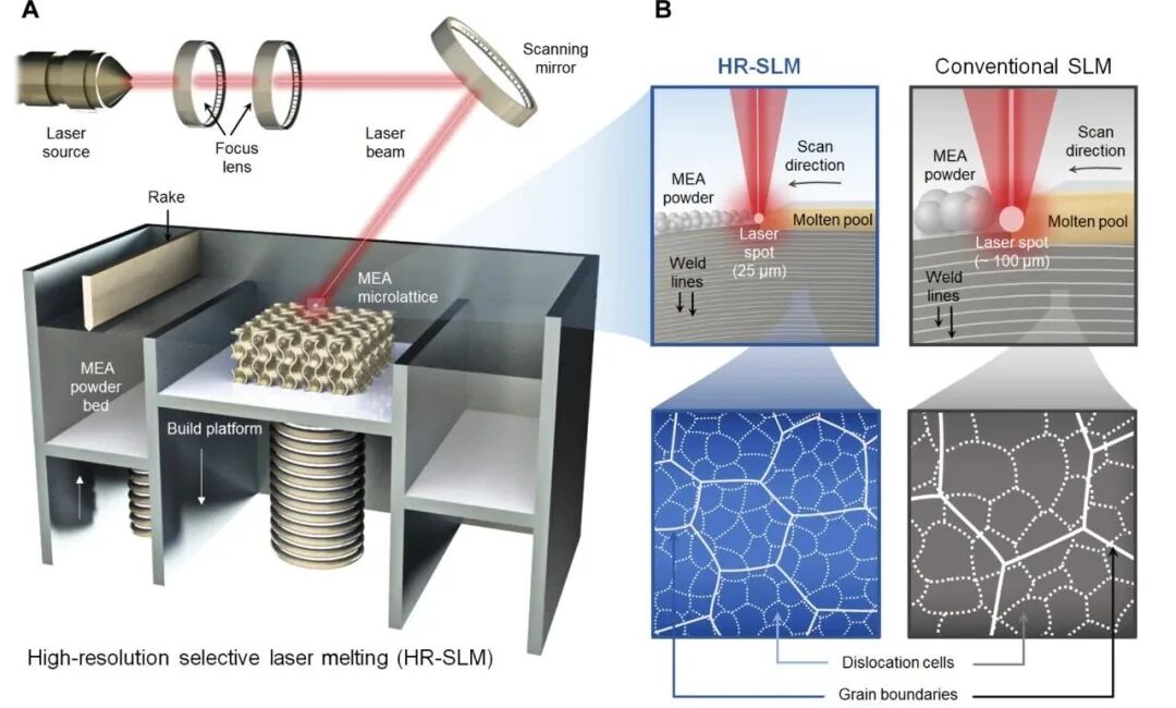 左:用于制造微晶格的HR-SLM系统示意图。右:HR-SLM系统与传统商业SLM系统在打印配置及微观结构(特别是位错细胞密度)方面的差异