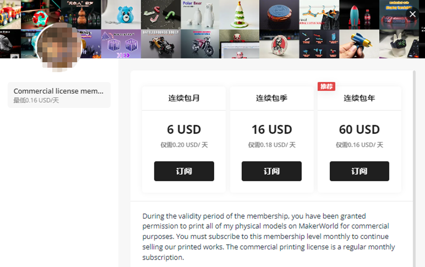 MakerWorld表示,针对有长期授权需求的用户来讲,更长的订阅期限可以减少每天的成本,与此同时平台承诺会给创作者提供更稳定、可预期的收入,他们可以凭借长期订阅获取收益。