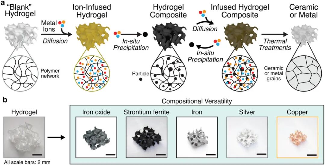 在经过5-10个这样的“生长循环”后,通过加热去除剩余的水凝胶,留下一个完美复制原始凝胶形状的金属或陶瓷结构。最终得到的物体异常致密而且耐用。由于金属盐是在打印步骤之后才添加的,因此一个水凝胶模型可以转化为多种金属、陶瓷或复合材料。