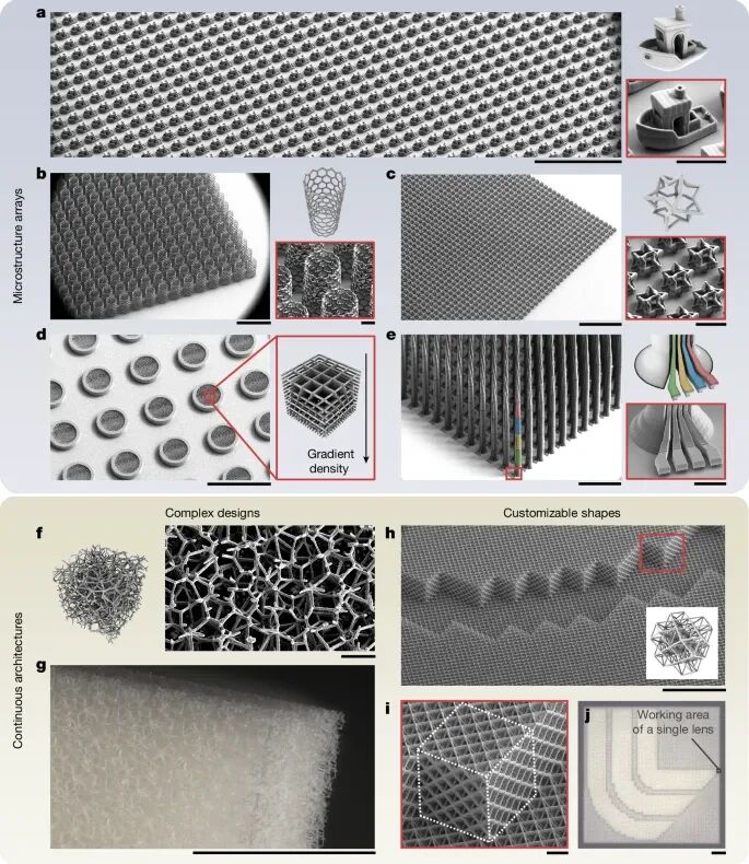 此外,他们还进一步开发了先进的数据处理和自适应曝光技术,使系统的制造能力进一步得到了提高。作为验证,他们打印了多种类型的复杂三维结构,如微尺度的象棋、梯度密度泡沫阵列、多深度微针阵列等等。在使用两个阵列时,打印面积达到了12厘米,可以实现对100亿个像素点的控制。