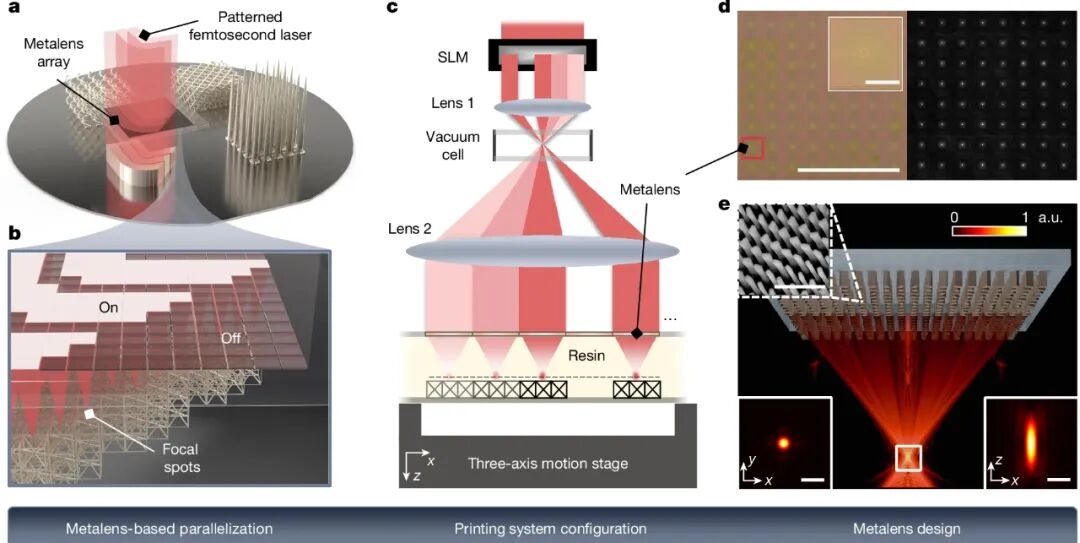 基于金属透镜阵列的双光子光刻示意图:图案化的飞秒激光投影到金属激光阵列上,生成用于并行三维纳米光刻的焦点