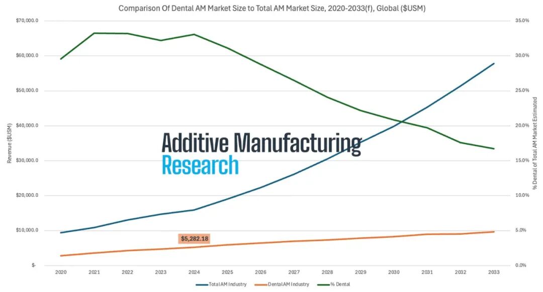 牙科作为3D打印技术的重要应用领域,正在以惊人的速度增长。根据AM Research(增材制造领域知名市场研究和行业分析提供商)于2025年6月发布的《2025年牙科3D打印市场研究与预测》,2024年牙科3D打印市场已达52亿美元,约占整个增材制造市场的三分之一。预计到2033年,牙科增材制造市场规模将增长近一倍,达到96亿美元。这一显著高于行业预期的数据显示出牙科行业3D打印应用的发展速度比人们想象的更为迅猛。这标志着,该报告所体现的市场规模在很大程度上已经可以与航空航天领域的应用占比相接近。