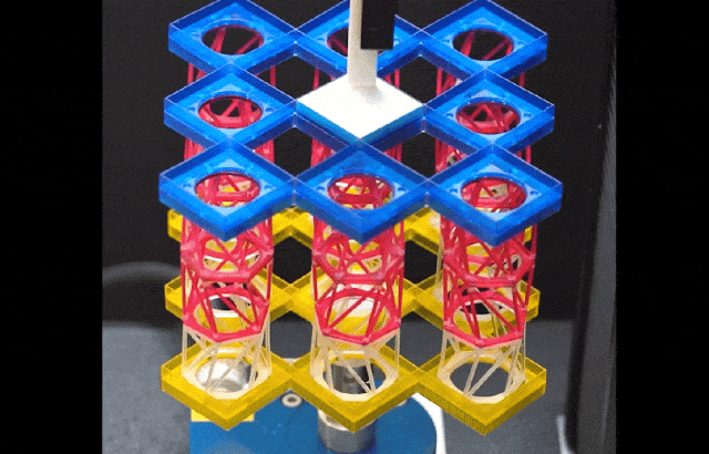 所开发的超材料结构能够在三维空间实现自由变形,通过单一控制即可实现平动+扭转的复合运动,还能在三个方向自由伸缩膨胀。它的创新在于模块化组装方式,能像乐高积木一样自由更换组件:既能调整出近零/负泊松比等特殊性能,又能预设多种稳定状态。