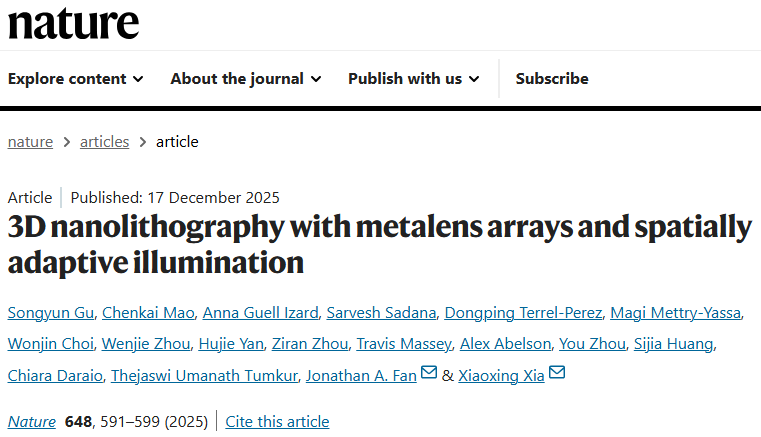 这篇以“3D nanolithography with metalens arrays and spatially adaptive illumination”为题的文章在nature发表。