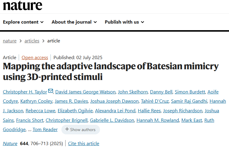 自英国诺丁汉大学的研究人员,在nature发表了题为“Mapping the adaptive landscape of Batesian mimicry using 3D-printed stimuli” 的文章。