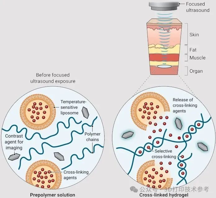 来自加州理工学院的高伟教授团队研发出了一款超声引导的3D打印技术平台,其借助聚焦超声以及超声响应生物墨水,可以直接在体内精准打印生物材料。这些生物墨水(也称超声墨水)融合了生物聚合物、成像造影剂与携带交联剂的温敏脂质体,能经注射或导管传送至体内深处的目标组织部位。