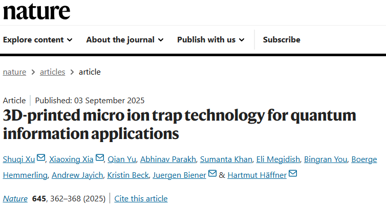 该研究以“3D-printed micro ion trap technology for quantum information applications”为题发表在Nature。