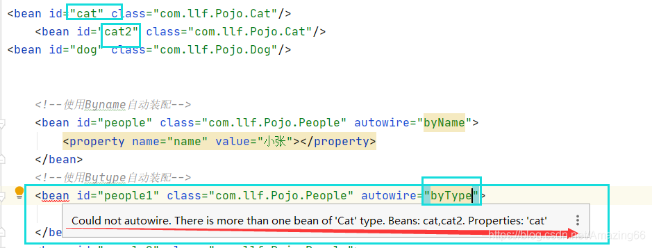 <bean id="people1" class="com.llf.Pojo.People" autowire="byType">
