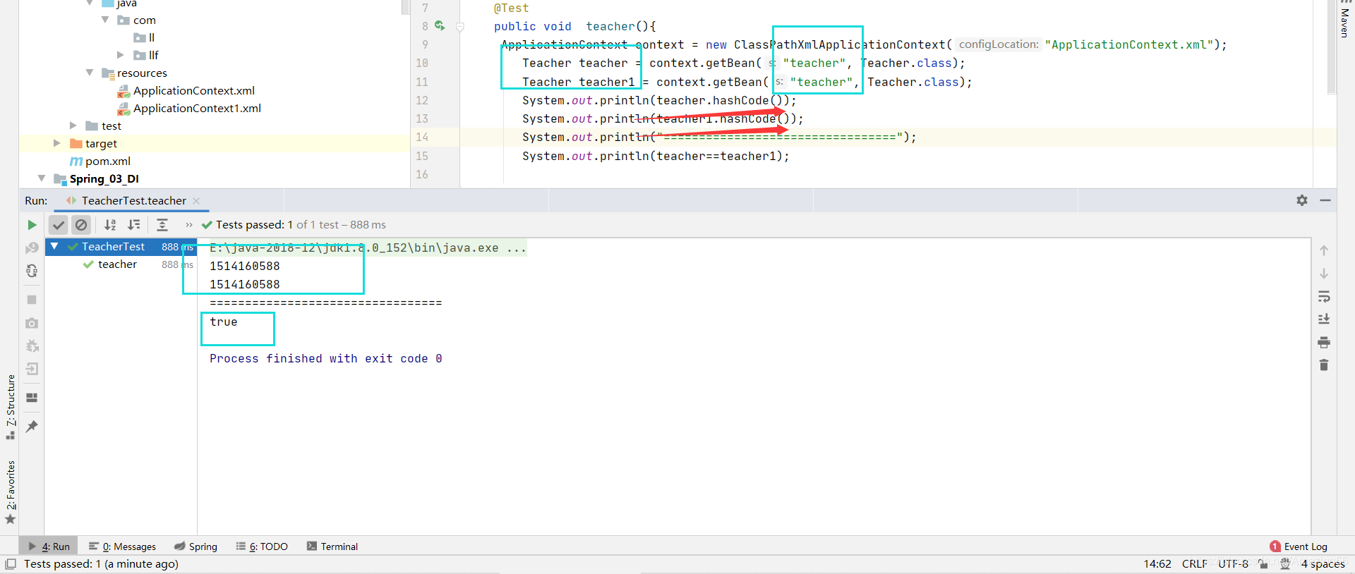 将teacher这个id取值两次 然后输出这两次的hashcode() 是相等的 而且两者做==判断 也是true 证明它就是单例模式 由于是Spring默认的作用域 所以不需要在xml中额外配置