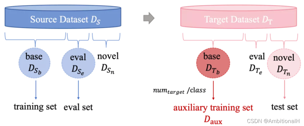 有点绕,其实就是源域数据 Sbase、Seval 用来训练和验证,目标域的数据 Tbase 用来辅助,同时目标域的数据 Tnovel 用来测试。训练和验证、辅助和测试这四种类别都不交叉。