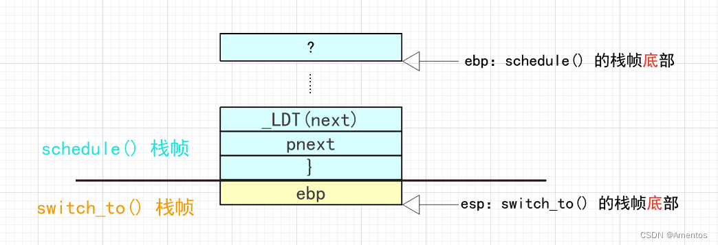 所以 ebp 入栈后内核栈变为:(这里 switch_to 的栈帧底部和顶部是一样的)