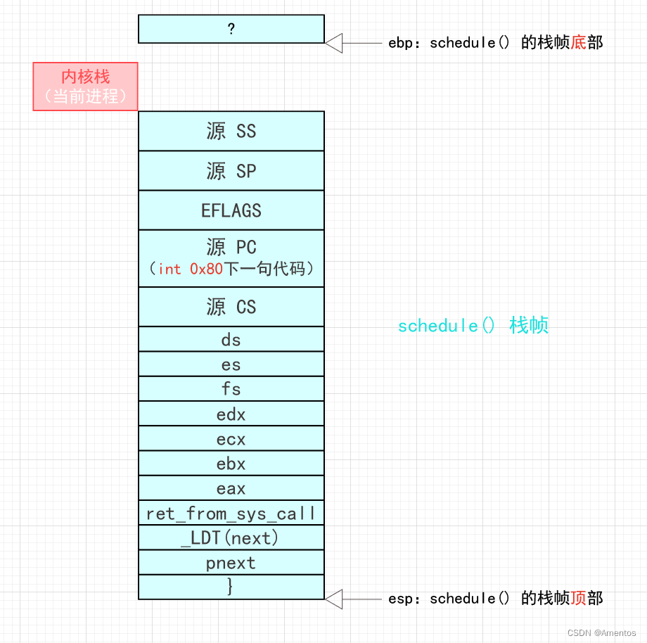 现在我们应该清楚,在执行上面的 switch_to 汇编代码前,当前进程内核栈的情况应该如下图所示(我们以在 schedule 中调用 switch_to 为例)。此时还没有进入 switch_to 函数,所以 ebp 和 esp 应该分别指向 schedule 函数的栈帧底部和栈帧顶部(栈帧底部具体在哪儿就不用管了)。
