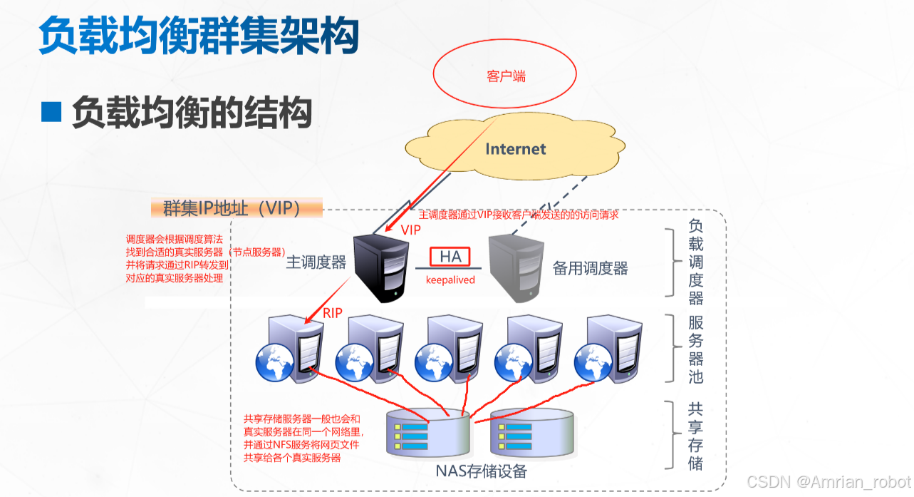 访问整个群集系统的唯一入口,对外使用所有服务器共有的VIP地址,也成为群集IP地址。通常会配置主、备两台调度器实现热备份,当主调度器失效以后能够平滑替换至备用调度器,确保高可用性。