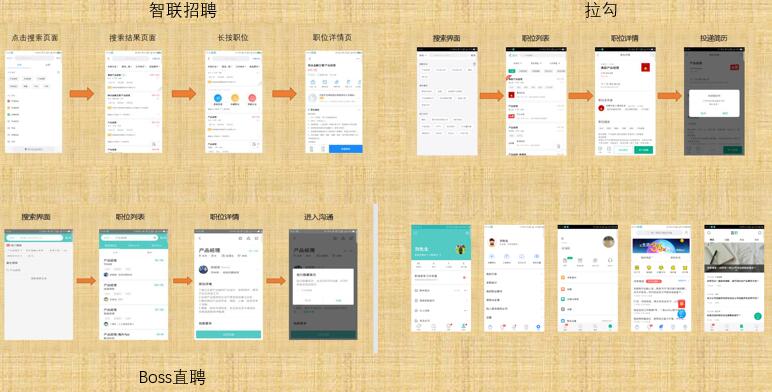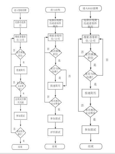 智联招聘和拉勾的用户求职流程大体相似,三者的较明显区别在于聊天功能,Boss直聘的求职流程不同之处在于需要先进行聊天并得到回复,才能正式开始求职流程。拉勾随时都可以聊天,而智联招聘则需要简历通过筛选才可以进行聊天。