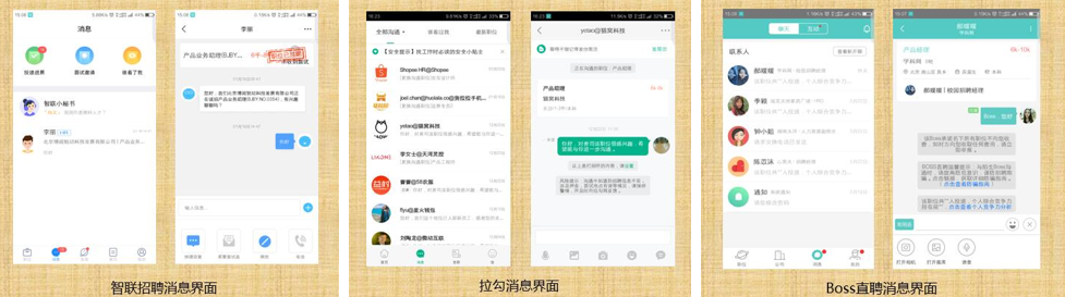 - 不足:职位发布者必须聊天才能进一步获取求职者信息,如果遇到很多不符合用人要求的求职者聊天,则导致沟通的成本比较高,在此过程中可能会降低企业的招聘效率。同时对于某些不善言辞的求职者而言,必须聊天则显得有些强人所难。