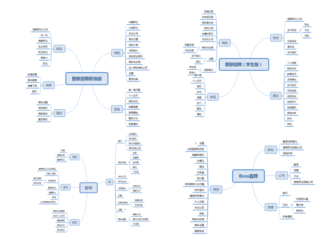 Boss直聘和拉勾两者信息架构也最为接近,拉勾划分为我的、职位、言职和消息四大功能模块,Boss则是将言职模块改为了公司模块。两者也将招聘和求职都整合到同一应用,在“我的”里面实现招聘者和求职者身份的切换,便于用户的使用,这里不多赘言。