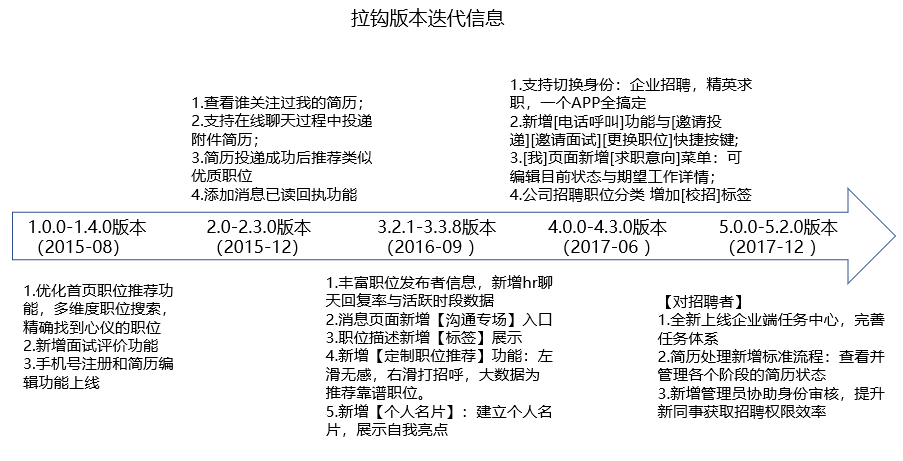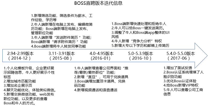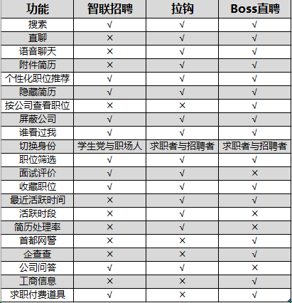 - 定位为互联网行业招聘,功能设计主要围绕“直聊”为核心,加快面试、即时反馈。同时加入了企业信息查询工具和首都网警,对招聘方的信息真实性要求较高。