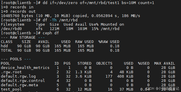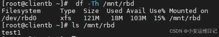 /dev/rbd0 xfs 121M 7.8M 113M 7% /mnt