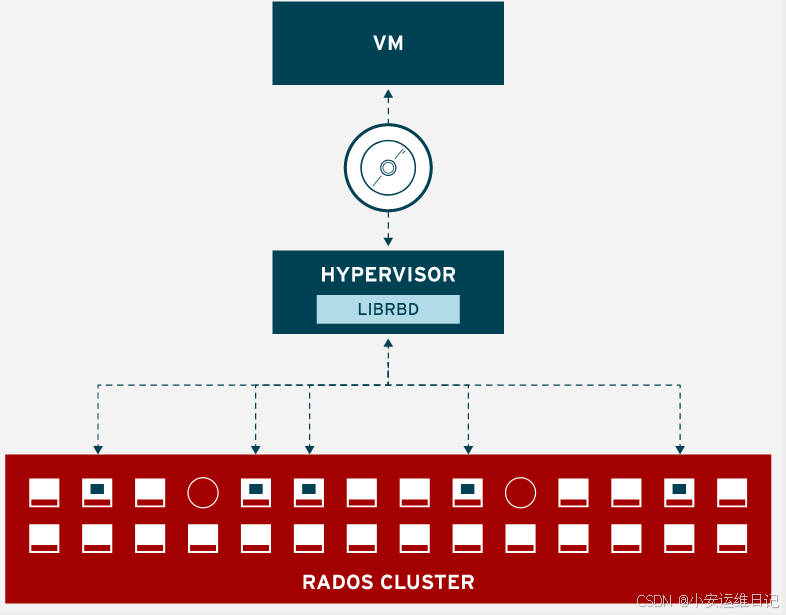 使用Linux内核的krbd可以将RBD镜像映射为一个Linux块设备,另外,Openstack或其他程序通过调用用户态的librbd接口也可以访问块设备,作为虚拟机和云主机的磁盘镜像。