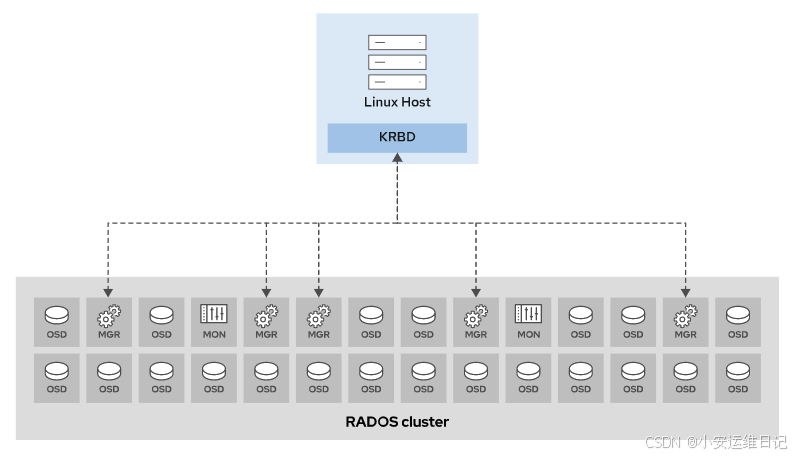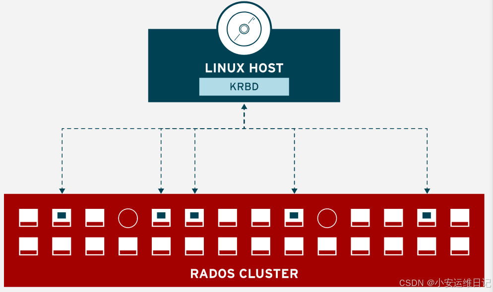 Ceph 客户机使用本地Linux内核模块krbd挂载RBD镜像。该模块将RBD镜像映射到名称为/dev/rbd0的Linux块设备。