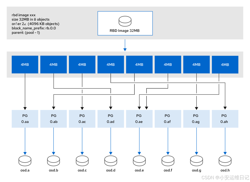 所有存储在RBD镜像中的对象数据,都有一个以RBD块设备名称前缀,我们可以使用rbd info查看镜像设备的前缀
