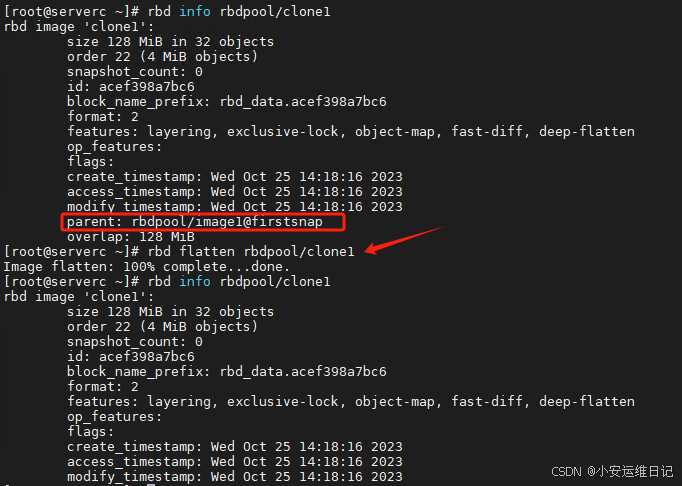 [root@serverc ~]# rbd snap create rbd/test@firstsnap