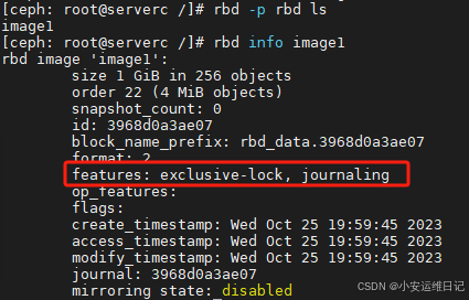 [ceph: root@serverc /]# rbd create image1 --size 1024 --pool rbd --image-feature=exclusive-lock,journaling