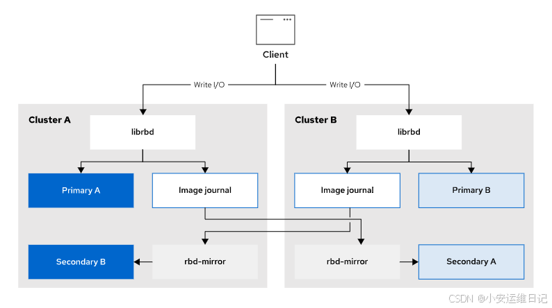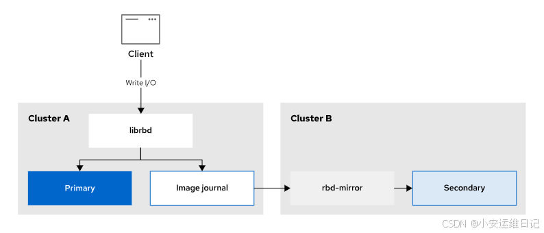RHCS支持在两个ceph集群间RBD镜像同步,这允许您自动将RBD镜像从一个RHCS集群复制到另一个远程集群(可以实现跨集群自动复制备份数据),该机制使用网络实现异步通信,将源(主)RBD镜像 镜像到目标(辅助)RBD镜像当发生故障时,你需要将源RBD降级,并把目标RBD升级 ;RBD镜像同步需要有 rbd-mirror进程,rbd-mirror进程从远程主机拉取数据并应用到本地存储镜像。