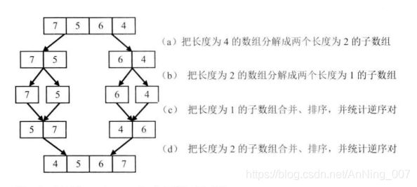 整个过程类似于归并排序,唯一不同就是记录逆序对的个数,即当P2<P1时,逆序对数就是P2数组中第一个元素到P2位置个逆序对。